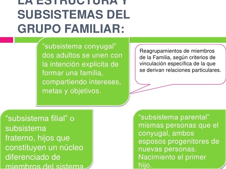 La familia se desarrolla y cumple sus funciones a través de subsistemas, formados por generación, sexo, interés y función.